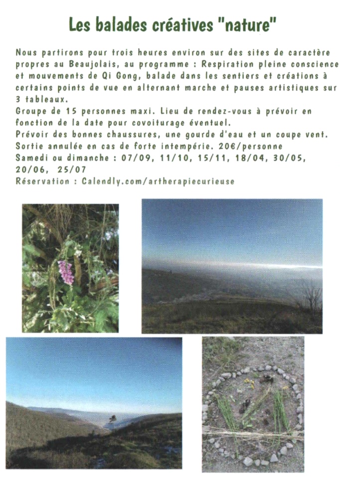 Balades créatives « Nature » : Et si vous laissiez la nature guider votre inspiration ? Sur les hauteurs du Beaujolais, pour respirer, créer dans un environnement magnifique, plus de détails sur Blog, dates et réservation sur Calendly.com/artherapiecurieuse