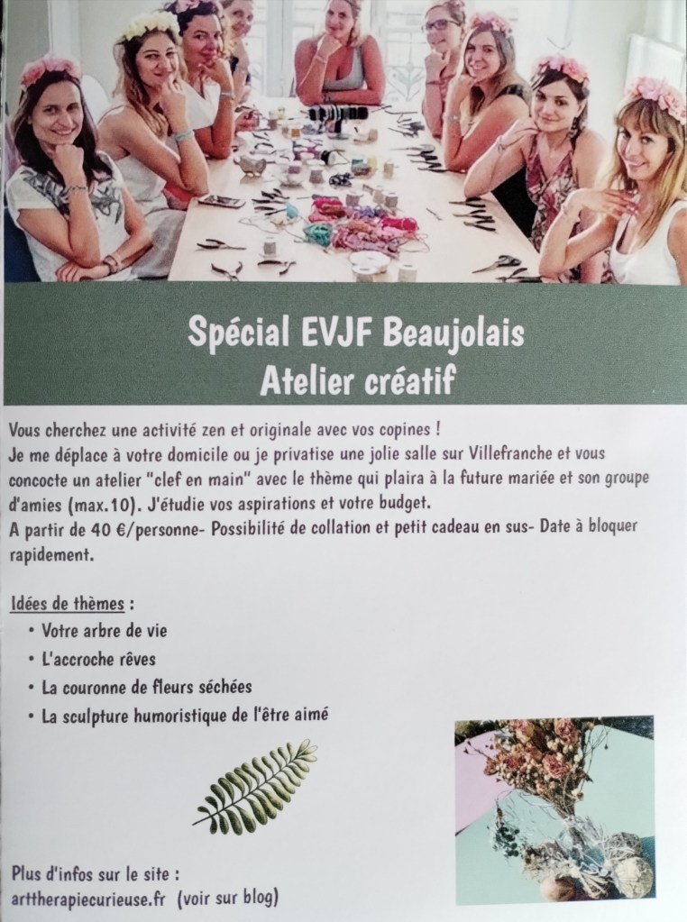 NOUVEAU ! Atelier à thème pour EVJF hors du commun ou autre évènement : Plongez dans une bulle de créativité et de bien-être. Chez vous ou dans un cadre privatisé, nous construisons ensemble un atelier sur mesure, en lien avec vos envies et votre budget. Entre rires, partage et exploration artistique, la future mariée repartira avec un souvenir unique et des émotions gravées à jamais. Pour bloquer la date 0670945460 ou artherapiecurieuse@gmail.com – Détails dans blog