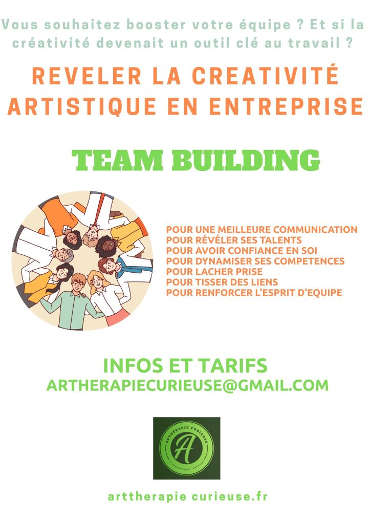 SPECIAL TEAM BUILDING : L’art-thérapie s’invite au cœur de votre entreprise pour renforcer la cohésion et l’épanouissement de vos équipes. Dans le cadre de votre politique RSE, ces ateliers favorisent la communication, la gestion du stress et la créativité collective. A travers des exercices adaptés à vos objectifs, vos collaborateurs vivront une expérience unique où chacun trouve sa place tout en contribuant à une dynamique commune. – Détails dans blog